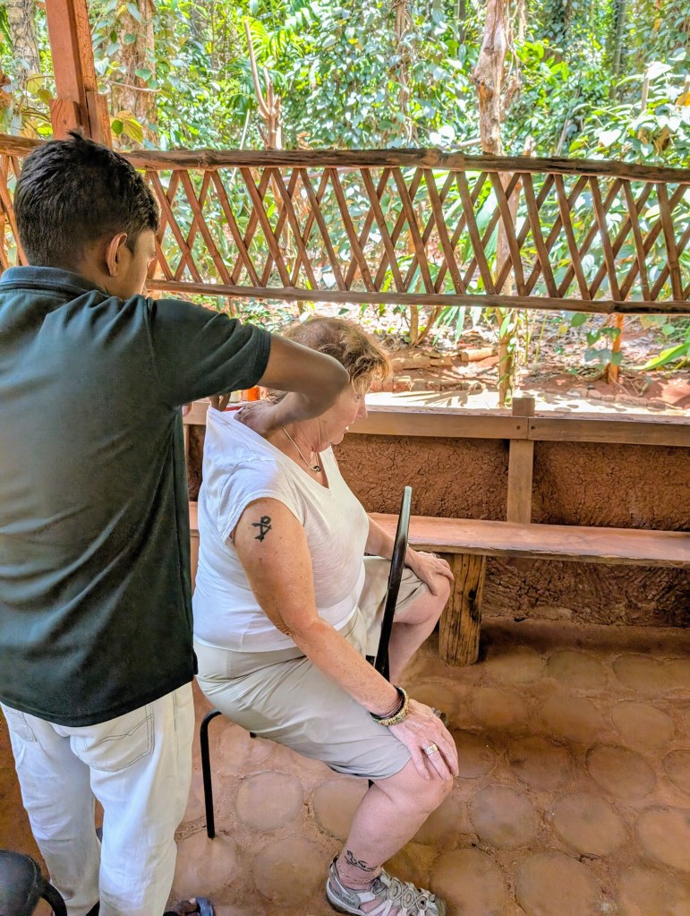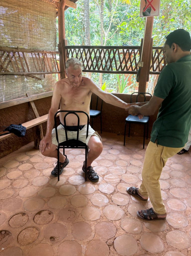 Klockan 08 var vi tillbaka till vårt hotell för en välförtjänt frukost och för en två timmars behandling på ett Ayurveda center .