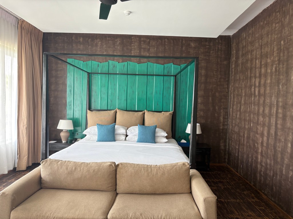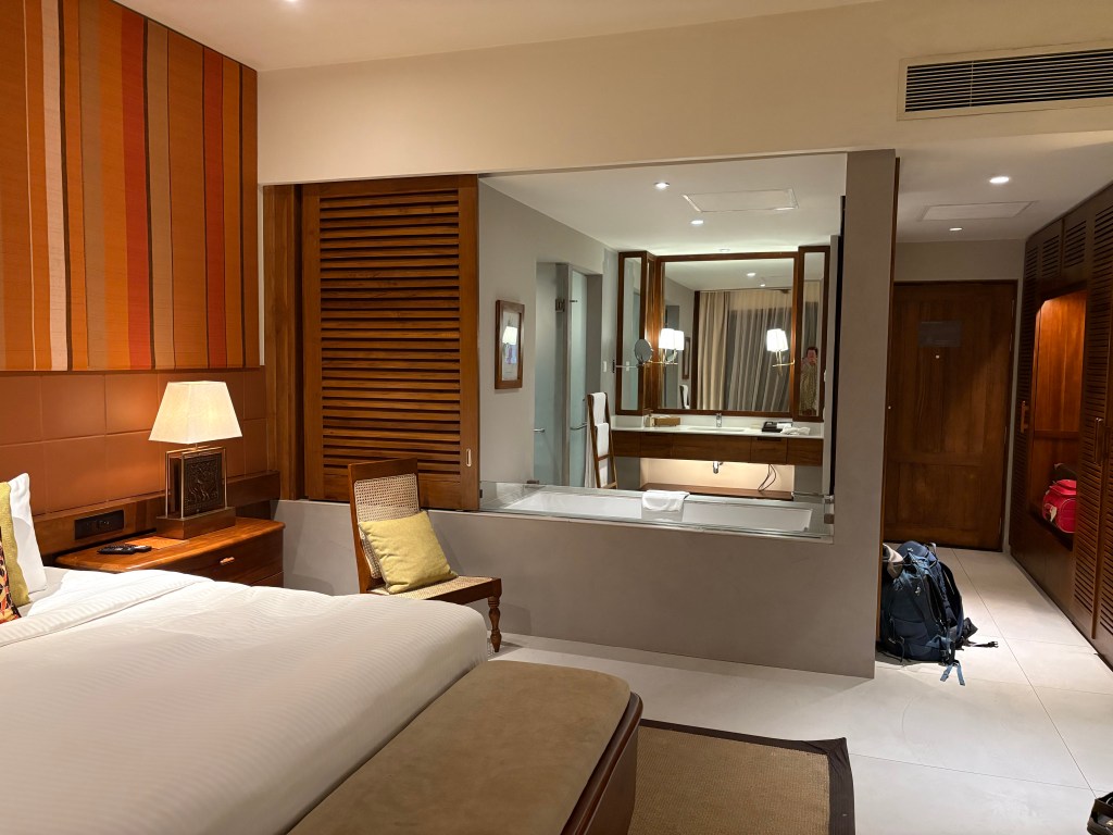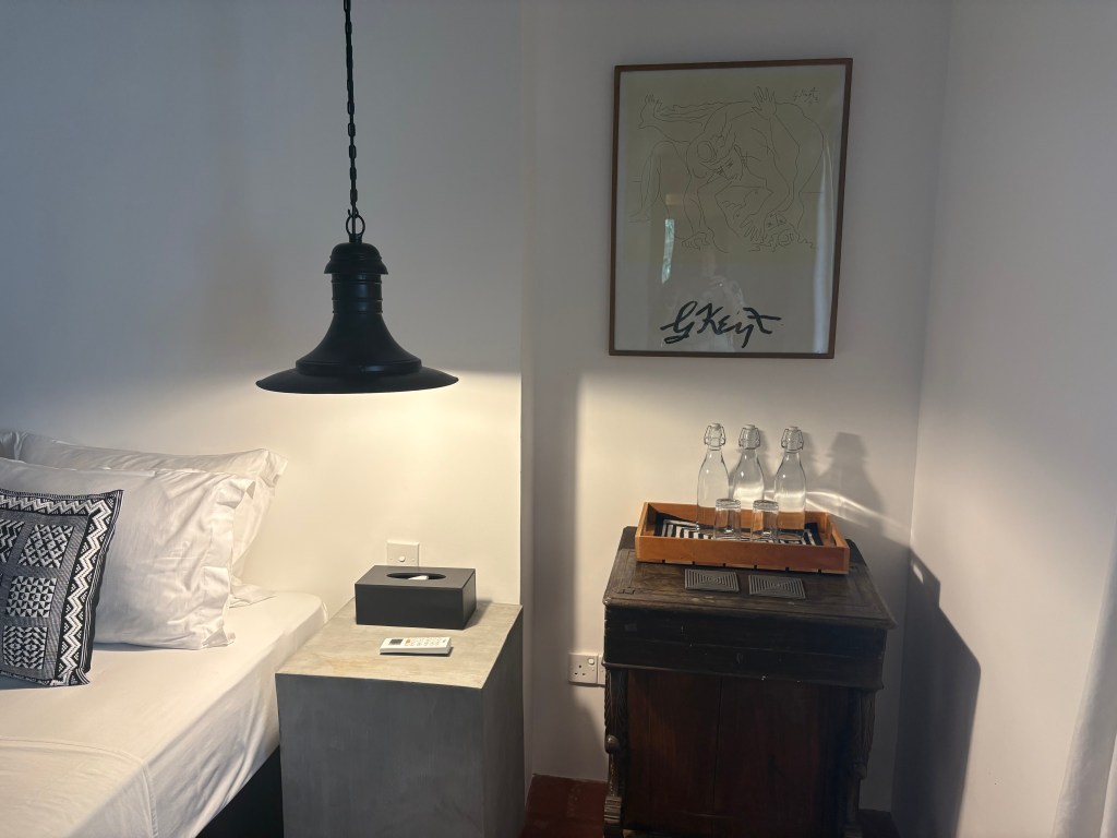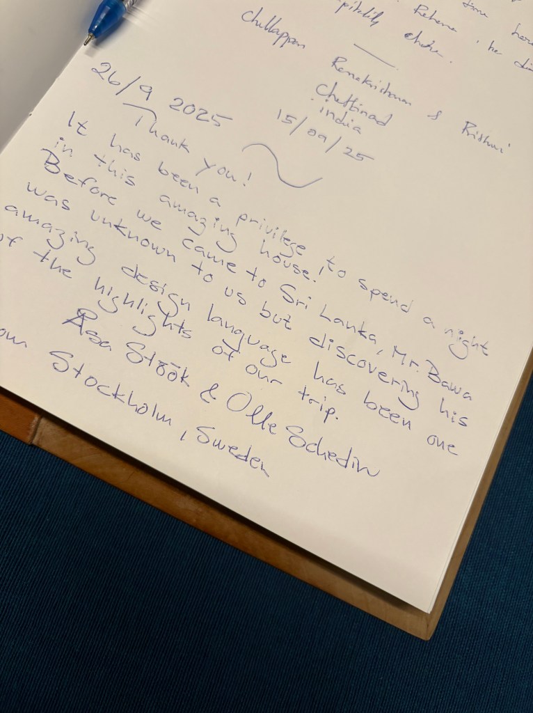 Nu har vi checkat in på ett av arkitekt Bawas hotell från 1967. Vi kom hit när det blivit mörkt så det ska bli spännande att utforska hotellet och stranden imorgon.