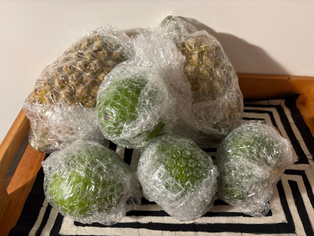Nyskördad ananas och avokado väl paketerade i bubbelplast samt slevar av kokosnöt.