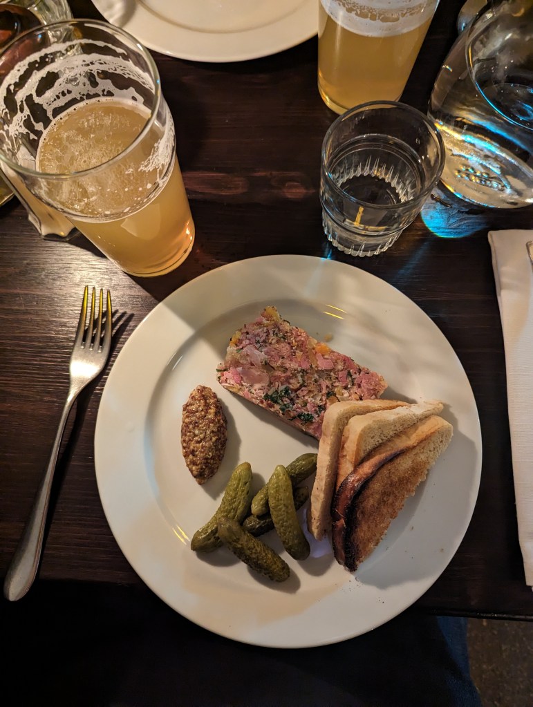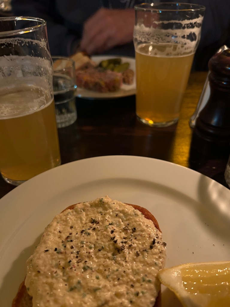 Vi började med Fläskterrine & senap respektive Krabbmajonäs på toast. Jättegott bortsett från att det inte var mycket krabbsmak i krabbmajonäsen.Fläskterrinen smakade dock mycket gott med cornichons och god senap.